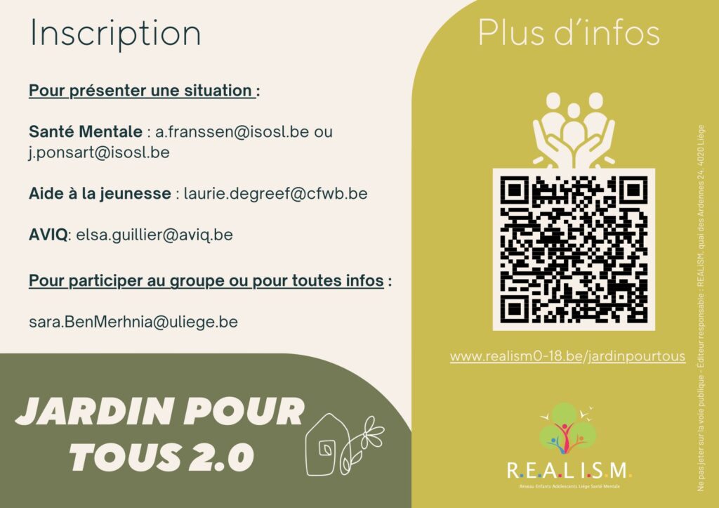 Jardin pour tous” est un espace d’échanges et de rencontres entre professionnels de différents secteurs de toute la province de Liège (aide à la jeunesse, handicap, santé mentale,…) à propos de situations autour desquelles les professionnels sont en réflexion.