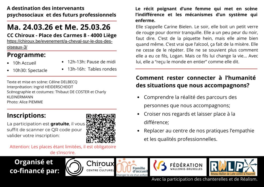 À la suite de la représentation de « À cheval sur le dos des oiseaux », plusieurs fois récompensée, des acteurs de terrain issus de divers secteurs (l’Aide à la Jeunesse et son Service de Prévention, les Chanterelles, des Services d’Accompagnement en Accueil Familial, le Realism, le RWLP et le Centre culturel des Chiroux) se sont associés pour organiser deux journées professionnelles afin de découvrir ce spectacle et ensuite participer à des échanges en lien avec la thématique les 24 et 25 mars 2026 (au choix).